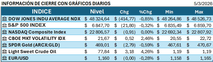 Desde la perspectiva de política monetaria, la data macroeconómica no provee una señal de ajuste clara para el timing de la Fed, según analistas citados por Reuters. A pesar de que los futuros del S&P 500 y Nasdaq 100 se negociaron al alza (S&P 500 Futures en 6,877.75 (+0.03%) y Nasdaq 100 Futures en 25,142.75 (+0.06%)) en la pre-apertura tras los datos de nóminas privadas y el PMI Non-Manufacturing en máximos de tres años, la subida del precio del petróleo actúa como una restricción inflacionaria, limitando el espacio para recortes de tasas y prolongando la incertidumbre sobre la estructura de costes.