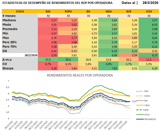 Considerando simultáneamente rendimiento, estabilidad y eficiencia riesgo-retorno: 1° VIDA PLENA — Mejor Sharpe (7.83), menor volatilidad (DS 0.2338), mayor mínimo histórico (5.37%). Operadora más eficiente del sistema. | 2° CCSS-OPC — Mejor promedio histórico (5.99%) y valor actual más alto (6.10%). Líder en rendimiento absoluto. | 3° BCR PENSIONES — Tercer Sharpe (5.31), segunda menor volatilidad (DS 0.2518). Desempeño sólido y consistente. | 4° BN-VITAL — Sharpe de 4.51 con promedio de 5.34% y baja dispersión. Perfil equilibrado. | 5° POPULAR PENSIONES — Mayor delta actual (+39.3 pb). Potencial de mejora visible en el corto plazo. | 6° BAC PENSIONES — Menor promedio (5.13%), mayor DS (0.3429) y menor Sharpe (3.28). Requiere mejoras en consistencia y eficiencia de gestión.