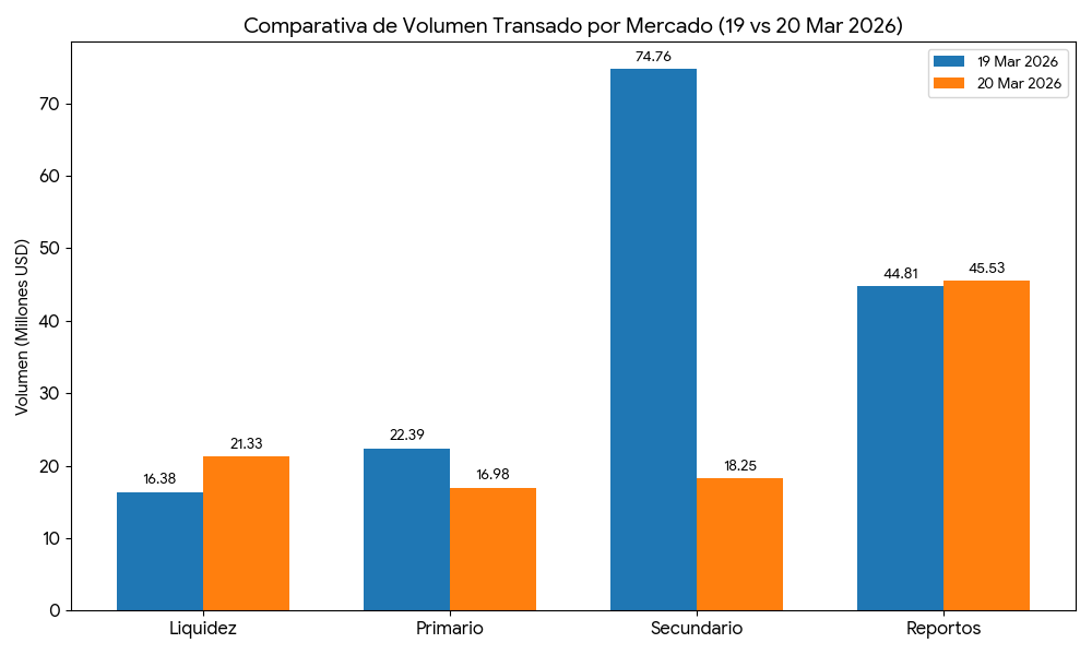 La sesión del 20 de marzo de 2026 se ha visto sacudida por un recrudecimiento de las tensiones en el Medio Oriente, lo que ha disparado los precios del crudo WTI y Brent, avivando temores de una inflación de oferta persistente. Este choque externo ha presionado los rendimientos de los bonos soberanos internacionales, con el UST de 10 años consolidándose cerca del 4.30%, lo que ha enfriado el apetito por activos de riesgo, especialmente en el sector tecnológico. A nivel local, el colón costarricense muestra una resiliencia notable, con un tipo de cambio de referencia que se sitúa en ₡464.54 para la compra y ₡469.69 para la venta. El mercado bursátil nacional ha respondido con un giro defensivo, reduciendo su volumen total transado a $102.09 millones, una contracción significativa respecto a la jornada previa. Se observa una migración clara hacia la preservación de capital, donde el mercado de reportos tripartitos lideró con un 44.60% del volumen, mientras que el mercado de liquidez duplicó su participación porcentual respecto al día anterior. Esta preferencia por el corto plazo y la liquidez inmediata refleja la cautela de los gestores locales frente a la volatilidad global y la incertidumbre sobre la futura senda de tasas del Banco Central, que mantiene su TPM en el 3.25% en un entorno de commodities al alza.