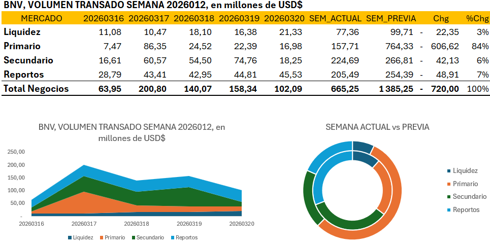 La duodécima semana del 2026 en la Bolsa Nacional de Valores de Costa Rica se caracterizó por una severa contracción del volumen transado total, el cual experimentó una caída del 52% respecto a la semana previa, situándose en los $665,25 millones tras la disipación del efecto extraordinario de las subastas primarias de Hacienda. La sesión de adjudicación conjunta entre el Ministerio de Hacienda y el Banco Central del 16 de marzo actuó como el catalizador inicial, aunque con una selectividad marcada que restringió la profundidad del mercado primario a solo $157,71 millones, una fracción de la actividad observada en periodos previos. El mercado secundario emergió como el principal motor de actividad con el 34% de la participación relativa, superando al mercado de reportos tripartitos, lo que sugiere una rotación de carteras activa y una formación de precios genuina en el tramo medio de la curva. El pico de negociación del martes 17, impulsado por la ventana de colocación primaria, no logró sostenerse hacia el cierre del periodo, donde el mercado de liquidez duplicó su volumen diario hacia el viernes, señalando un estrujamiento estacional de los recursos de corto plazo. Esta normalización de los flujos evidencia un mercado que, ante la ausencia de eventos de colocación masiva, ha retornado a una dinámica de gestión de balances y optimización de tesorerías, donde los gestores de portafolio prefieren la formación de precios en firme sobre la incertidumbre de las ventanillas oficiales.
