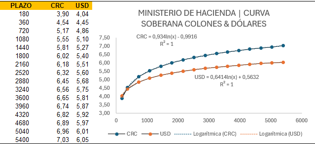 El análisis técnico de la curva de rendimientos revela una segmentación clara entre las expectativas de política monetaria y el riesgo de duración. Para los títulos en colones (CRC), la estructura de plazos obedece a la función $CRC = 0,934 \ln(x) – 0,9916$, lo que denota una convexidad moderada donde el premio por plazo se acelera en el tramo corto-medio pero tiende a estabilizarse en el nodo de 15 años (5400 días) en el 7,03%. Por su parte, la curva en dólares (USD), regida por $USD = 0,641 \ln(x) + 0,5632$, presenta una pendiente significativamente más plana, manteniendo un techo de 6,05% para el mismo plazo. Esta convergencia en los tramos cortos, donde el diferencial entre colones (3,90%) y dólares (4,04%) a 180 días es de apenas 14 puntos base a favor de la divisa, genera una presión de arbitraje que incentiva la dolarización de los portafolios de corto plazo. No obstante, en el tramo largo, el diferencial se amplía a 98 puntos base, reflejando una prima por riesgo inflacionario y cambiario que el mercado exige para mantener posiciones estructurales en moneda local.