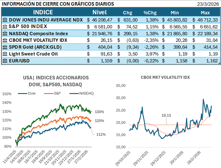 El sentimiento de los inversores globales este 23 de marzo de 2026 estuvo marcado por la volatilidad derivada del conflicto en el Estrecho de Ormuz, donde la tensión geopolítica dicta el ritmo de los activos de riesgo. Aunque el anuncio de una pausa en las acciones militares permitió un rebote técnico en Apple y Nvidia, el mercado se mantuvo cauteloso ante el crudo WTI rondando los $90 y el oro cediendo terreno frente al alza en los rendimientos de los bonos. En el plano corporativo, Tesla acapara miradas con su ambiciosa inversión de $20 mil millones en Texas para autonomía de chips y robótica.