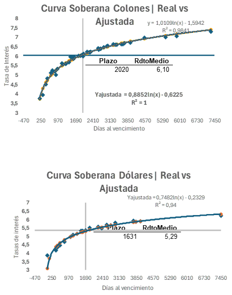 El análisis de las curvas soberanas revela una curva en colones con buen ajuste (R=0.9346), donde emisiones como G300926 exhiben un exceso de 29 pb (rendimiento 4.25% vs. ajustada 3.96%), CRMG240430 con 15 pb (5.98% vs. 5.83%) y CRMG220328 con 11 pb (5.28% vs. 5.17%). Se identifican 13 series con Ispread positivo relevante superior a 5 pb, recomendables para compra, con topes como CRG271038 (11 pb) y G210335 (9 pb), indicando oportunidades en plazos medios a largos. La curva real vs. ajustada confirma distorsiones atractivas en el segmento soberano del Ministerio de Hacienda.[