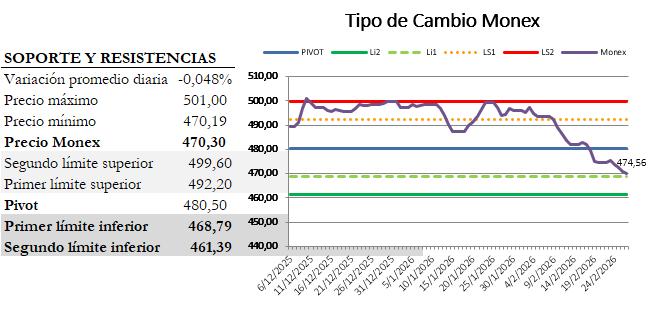 - Perspectiva Técnica: El precio Monex actual se ubica peligrosamente cerca del Primer Límite Inferior (¢468,79). Romper este soporte técnico podría acelerar las liquidaciones de posiciones en dólares.