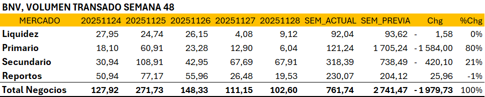 En conjunto, la semana 48 estuvo marcada por una contracción abrupta en el volumen negociado, liderada por el mercado primario, mientras que los segmentos de liquidez y reportos ofrecieron señales de estabilidad operativa. El comportamiento sugiere una transición táctica en la estructura de negocios, con énfasis en preservación de liquidez y cautela en nuevas emisiones, con un Ministerio de Hacienda que podríamos decir tiene mayores grados de libertad para lo que resta del año e inicios del 2026.