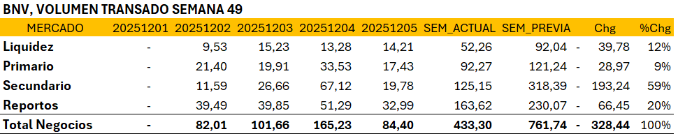 En el ámbito bursátil, la Bolsa Nacional de Valores reflejó una marcada disminución en el volumen transado durante la semana 49 respecto a la anterior. El total de negocios alcanzó $433,30 millones, frente a $761,74 millones en la semana previa, lo que significó una caída de $328,44 millones. El mercado de liquidez cerró con $52,26 millones, mostrando una reducción de $39,78 millones respecto al periodo anterior, mientras que el mercado primario registró $92,27 millones, con una variación negativa de $28,97 millones. El mercado secundario fue el que más retrocedió, al pasar de $318,39 millones a $125,15 millones, una contracción de $193,24 millones que evidenció menor dinamismo en las transacciones de títulos ya emitidos. Los reportos también mostraron una baja, con $163,62 millones frente a $230,07 millones en la semana previa, reflejando una disminución de $66,45 millones. La tendencia semanal estuvo marcada por una menor actividad en todos los segmentos, con especial incidencia en el secundario, lo que explica la caída general del volumen bursátil y confirma un cierre de año con ajustes en la liquidez y en la rotación de instrumentos financieros. En circunstancias donde Banco Central más que Hacienda, será el que provea del papel requerido por los gestores de portafolios e inversión de los excesos de liquidez del sector institucional, mientras valoran el nuevo contexto de inversión para el periodo 2026-27.